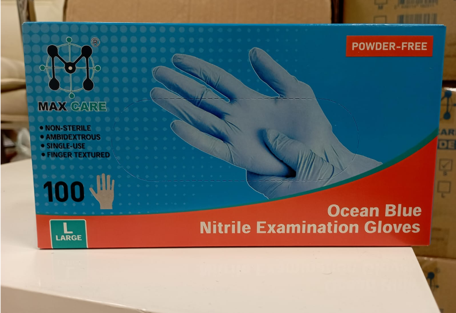 These are Max Care brand disposable nitrile examination gloves, typically packaged in boxes of 100.